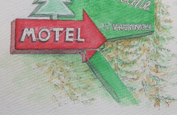 A real crux was the neon tubes. I first tried using my finest brush and white watercolor, but it just looked clunky. I finally opted for a combo of that white and very light, broken pencil lines. Probably purest WC painters cringe when I say “pencil lines”, but this bit of mixed-media often seems to work best for me. Overall, I’m very happy with it, I like this sign and am very happy with my painting. Room to grow and improve, yes … but happy.