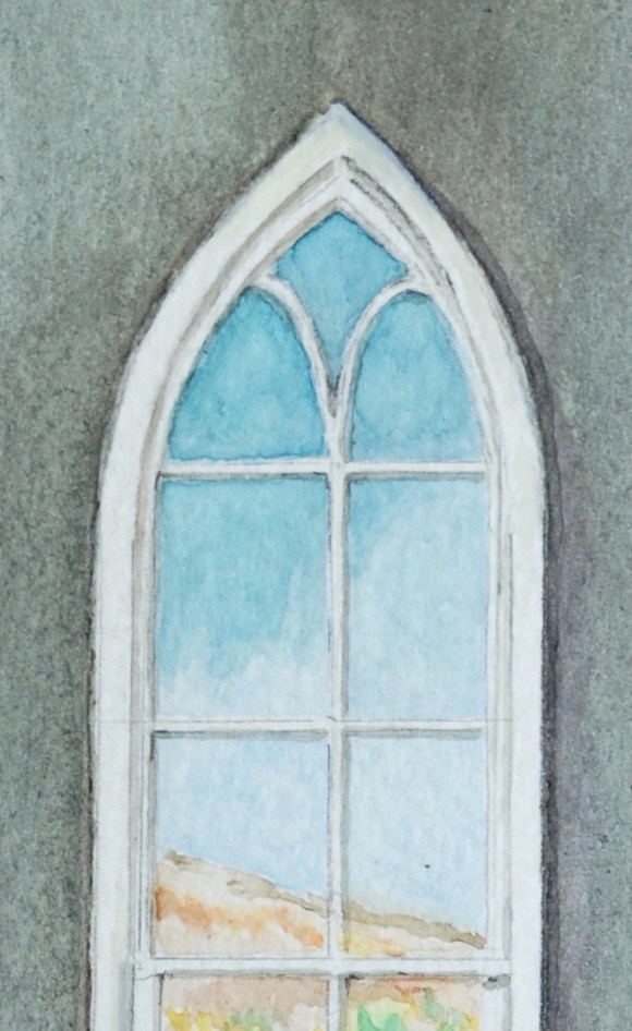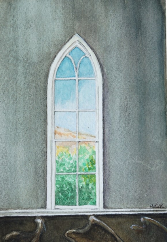 Painting the steeples, I often have thought of the beautiful church windows below. Some are stained-glass, some clear, some with arched shapes … all with a spiritual and practical role. In contrast to steeples, they are usually best experienced from within the church. While all, as windows, provide some degree of light, they also tell a story: stained-glass a pictorial story, clear-pained offer the story of the outside view … from within, looking out.