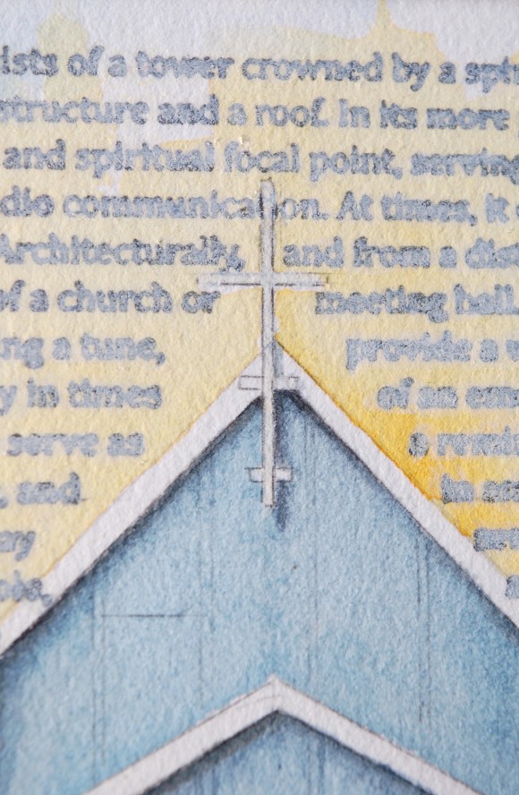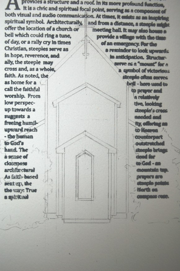 Some churches/steeples are dramatic, graceful architectural up-thrusts … beautiful, regal and formal. Fancy filigree, crisp whitely-painted defined moldings, beautiful shingling. An architectural equivalent of putting on your Sunday best … pipe organ strains of Bach flowing thru the double-arched doors. Gloriously uplifting and beautiful.
