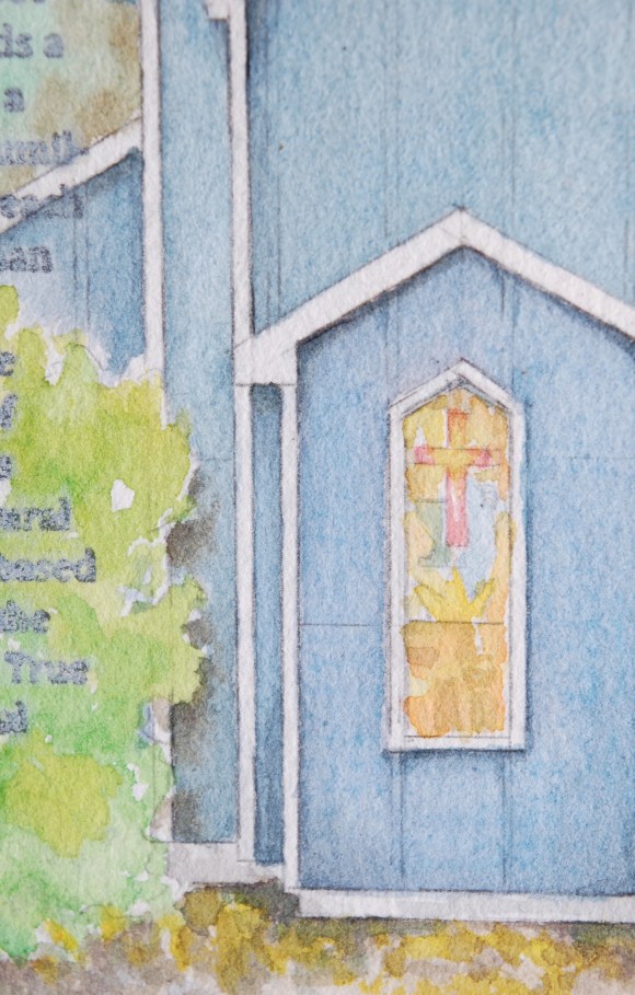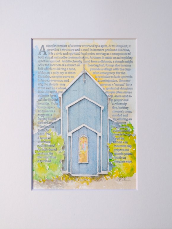 As I said, I like the variety, probably because I like the intent – or at least, the implied intent. Know this, reader: not all churches that have inspired my little paintings are churches I would attend. Others: gladly. If I ever get into painting restaurant signs, the same will be true. I don’t particularly like bad food. 🙂