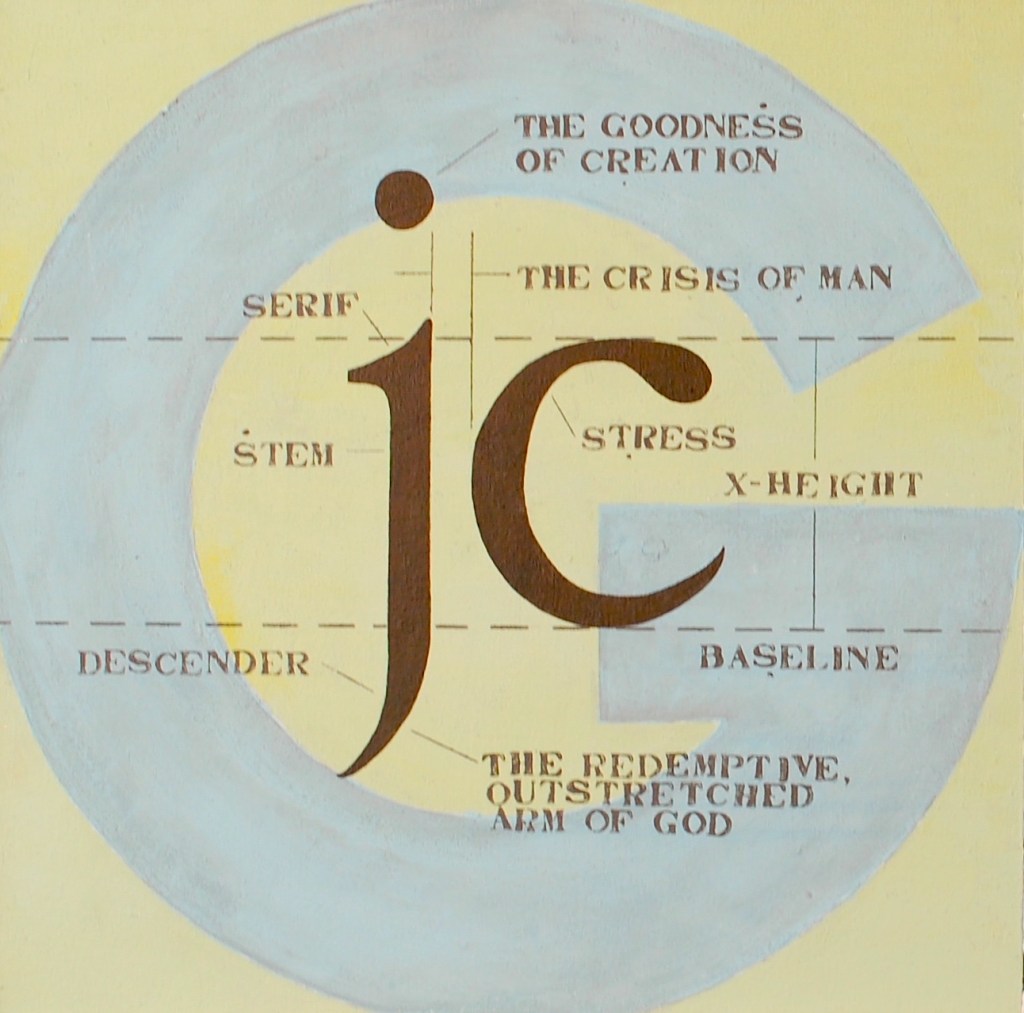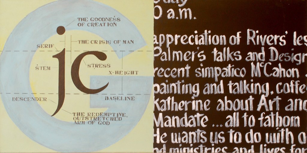 Anyways, here’s one of my establishing, recent-ish paintings to consider. Again, nodding toward Dr. Palmer, also to Larry Rivers, to a very recent discovery (for me) – Colin McCahon … and to design/typographic sensibilities.